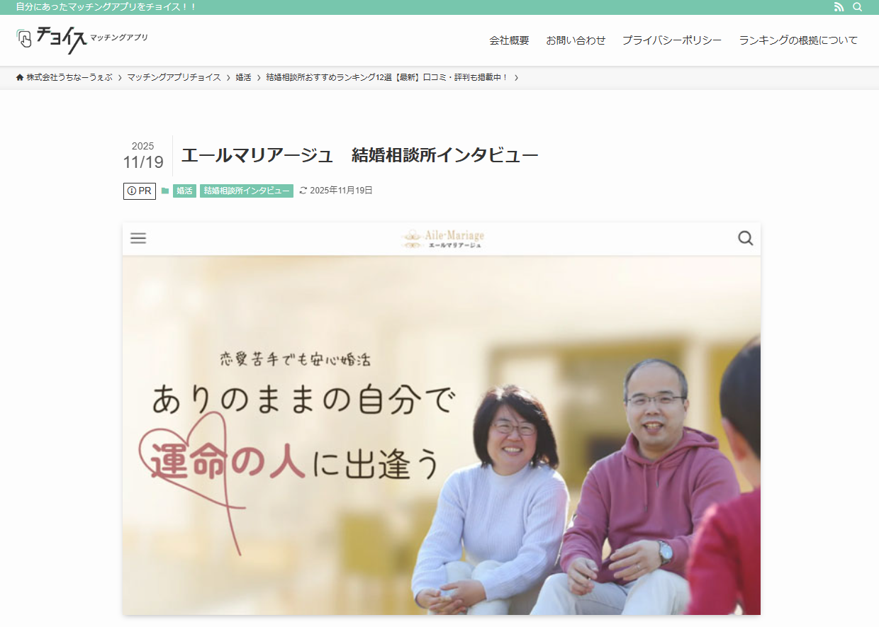 株式会社うちなーうぇぶ様が運営されているマッチングアプリ比較サイト『マッチングアプリチョイス』にて、ご紹介していただきました。